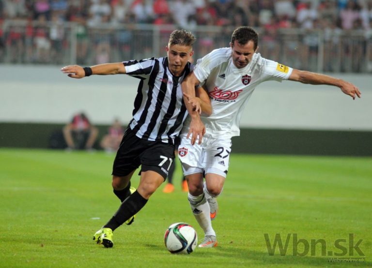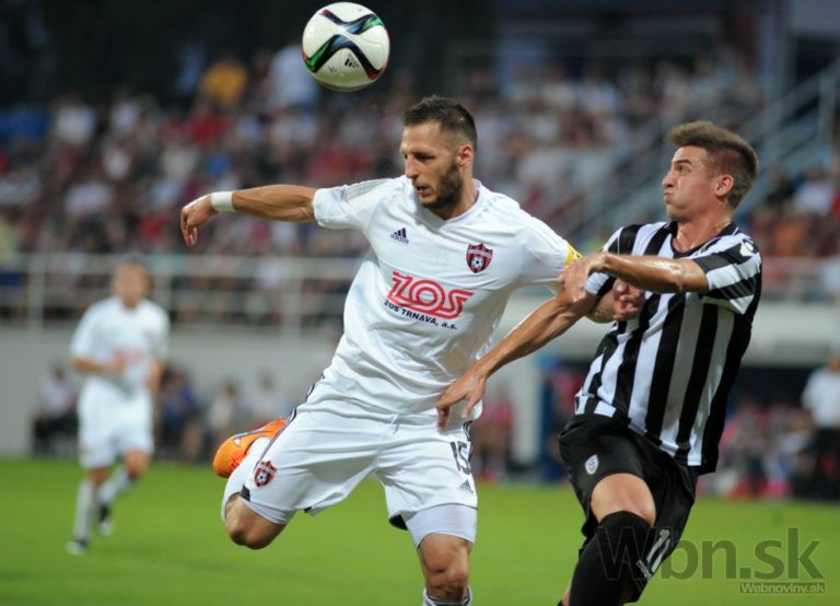 Miloš Nikolič z FC Spartak Trnava (vľavo) a Róbert Mak z PAOK Solún (vpravo) v odvetnom zápase 3. predkola Európskej ligy FC Spartak Trnava (SR) - PAOK Solún (Gréc.). Zlaté Moravce, 6. august 2015. Foto: SITA/Martin Havran