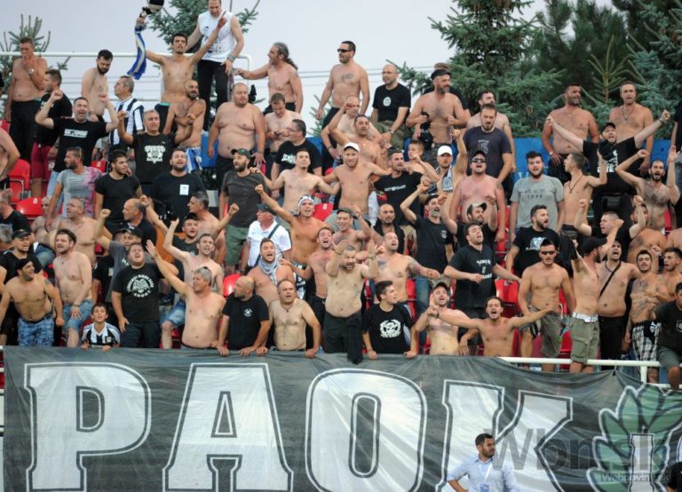 Fanúšikovia z PAOK Solún v odvetnom zápase 3. predkola Európskej ligy FC Spartak Trnava (SR) - PAOK Solún (Gréc.). Zlaté Moravce, 6. august 2015. Foto: SITA/Martin Havran