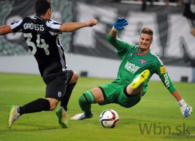 Brankár Luboš Kamenár z FC Spartak Trnava (vpravo) a Nikos Korovesis z PAOK Solún (vľavo) v odvetnom zápase 3. predkola Európskej ligy FC Spartak Trnava (SR) - PAOK Solún (Gréc.). Zlaté Moravce, 6. august 2015. Foto: SITA/Martin Havran