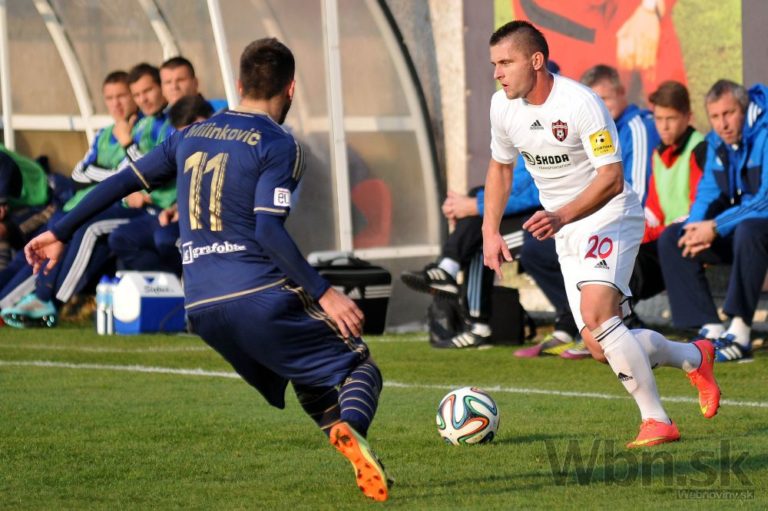 Sprava: Hráč Trnavy Matúš Čonka a hráč Slovana Marko Milinkovič počas dohrávky 3. kola Fortuna ligy 2014/2015 v zápase medzi FC Spartak Trnava a ŠK Slovan Bratislava. Trnava, 30. október 2014. Foto: SITA/Ivan Kopčáni