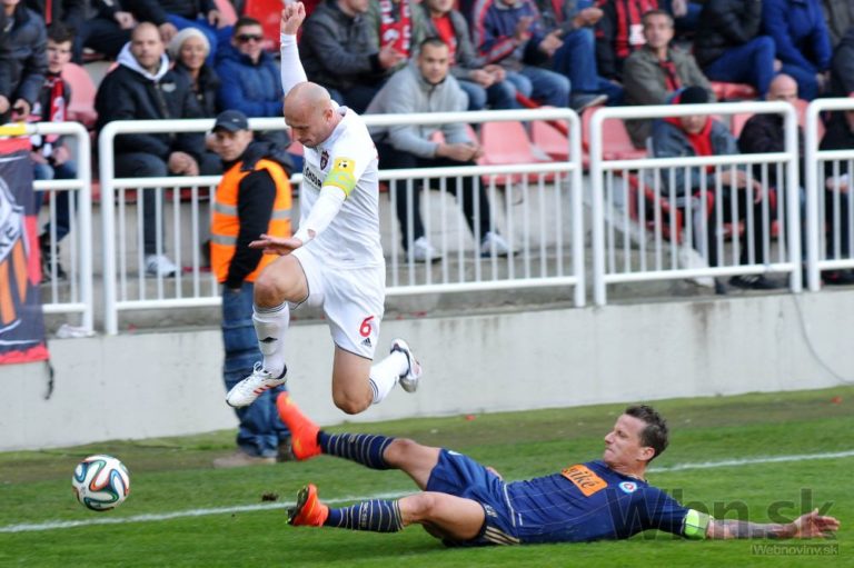 Zľava: Hráč Trnavy Marek Janečka a hráč Slovana Igor Žofčák počas dohrávky 3. kola Fortuna ligy 2014/2015 v zápase medzi FC Spartak Trnava a ŠK Slovan Bratislava. Trnava, 30. október 2014. Foto: SITA/Ivan Kopčáni