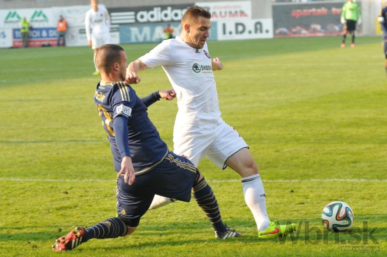 Zľava: Hráč Trnavy Martin Mikovič a hráč Slovana David Hudák počas dohrávky 3. kola Fortuna ligy 2014/2015 v zápase medzi FC Spartak Trnava a ŠK Slovan Bratislava. Trnava, 30. október 2014. Foto: SITA/Ivan Kopčáni