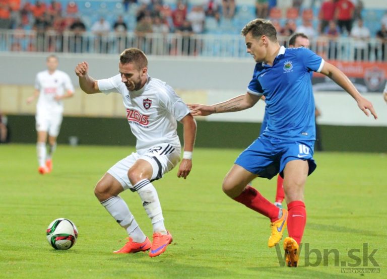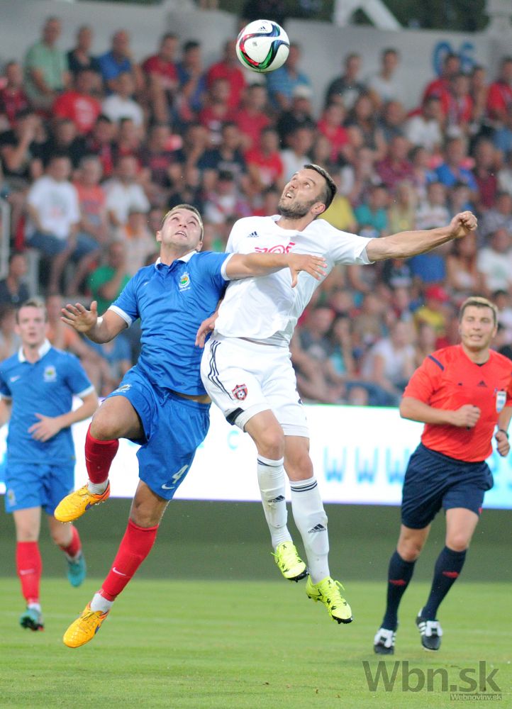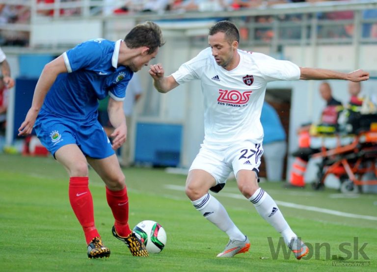 Tomáš Mikinič z FC Spartak Trnava (vľavo) a Matthew Clarke z Linfield FC (vpravo) počas prvého zápasu 2. predkola Európskej ligy 2015/2016 medzi FC Spartak Trnava (SR) – Linfield FC (Sev. Ír.). Zlaté Moravce, 16. júl 2015. Foto: SITA/Martin Havran