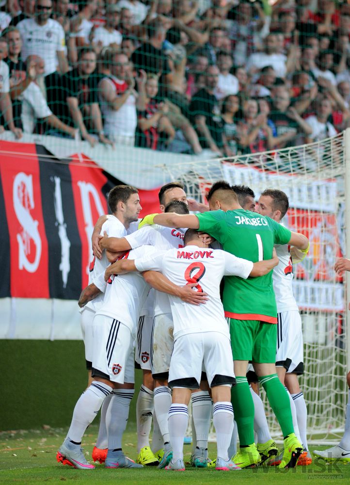 Radosť hráčov z FC Spartak Trnava počas prvého zápasu 2. predkola Európskej ligy 2015/2016 medzi FC Spartak Trnava (SR) – Linfield FC (Sev. Ír.). Zlaté Moravce, 16. júl 2015. Foto: SITA/Martin Havran