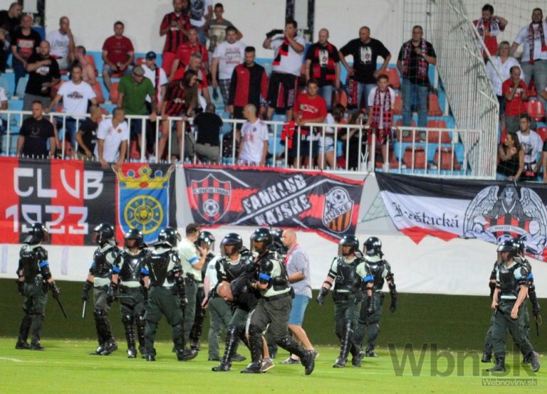 Zásah polície proti fanúšikom FC Spartak Trnava v polčase prvého zápasu 2. predkola Európskej ligy 2015/2016 medzi FC Spartak Trnava (SR) – Linfield FC (Sev. Ír.). Zlaté Moravce, 16. júl 2015. Foto: SITA/Martin Havran