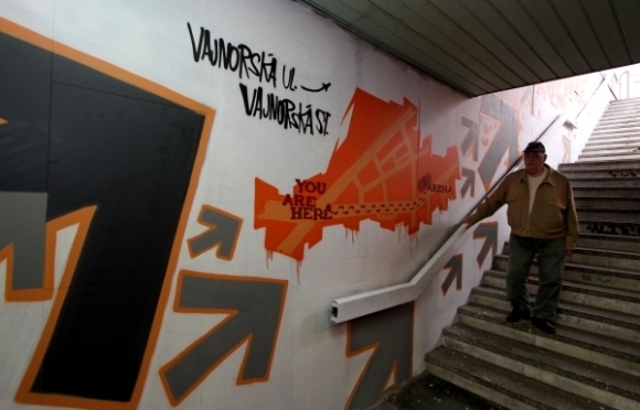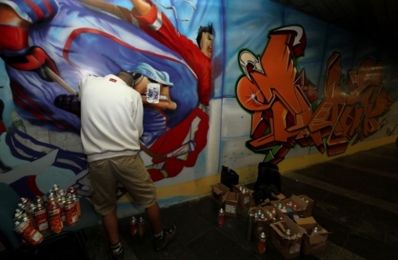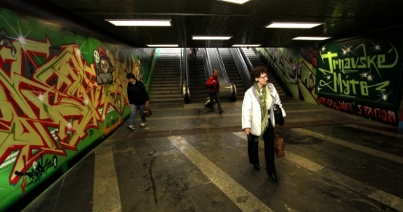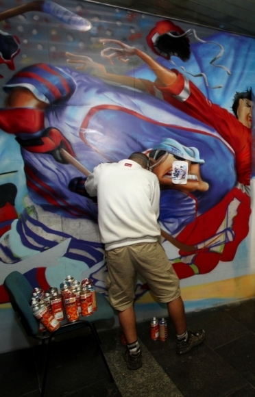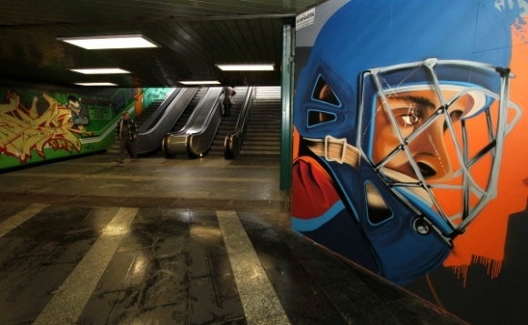 Znehodnotené priestory podchodu na Trnavskom mýte získali nový, moderný vzhľad. Steny podchodu zdobia stovky grafitových náterov, obrázky tematicky venované nielen majstrovstvám sveta v ľadovom hokeji, ale aj dopravnej využiteľnosti tohto dôležitého verejného priestoru. Foto: SITA/Ľudovít Vaniher
