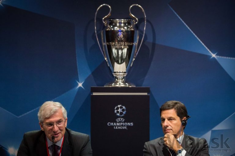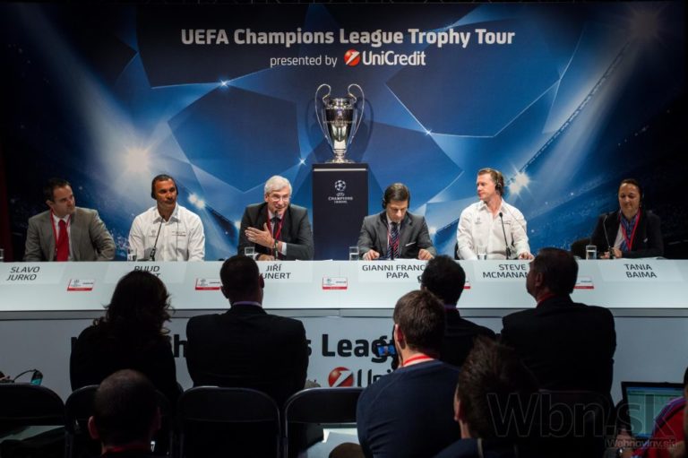 Sprava: Riaditeľ Divízie pre SVE skupiny UniCredit Gianni Franco Papa a predseda predstavenstva a generálny riaditeľ UniCredit Bank Czech Republic and Slovakia Jiří Kunert počas turné trofeje pre víťaza Ligy Majstrov UEFA Champions League Trophy Tour na Slovensku. Bratislava, 26. september 2014. Foto: SITA/Jozef Jakubčo