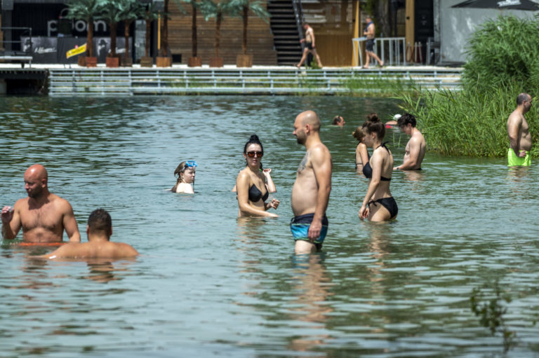 Ľudia osviežujúci sa na Zlatých pieskoch počas tropických teplôt v uliciach hlavného mesta Bratislava. Bratislava, 21. jun 2024. Foto: SITA/Milan Illík