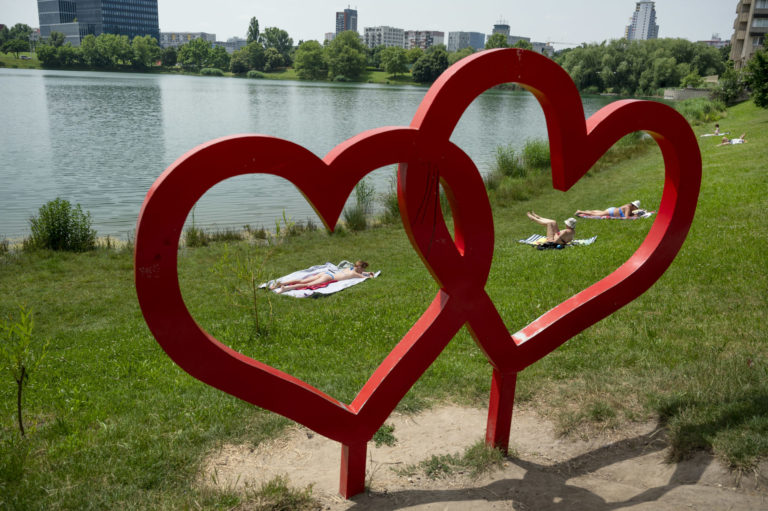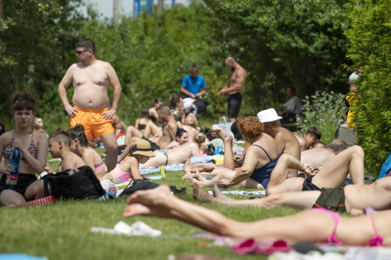 Ľudia oddychujú na Zlatých pieskoch počas tropických teplôt v uliciach hlavného mesta Bratislava. Bratislava, 21. jún 2024. Foto: SITA/Milan Illík
