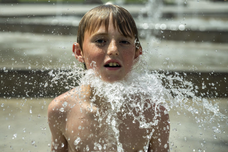 Chlapec osviežujúci sa vo fontáne Družba počas tropických teplôt v uliciach hlavného mesta Bratislava. Bratislava, 21. jún 2024. Foto: SITA/Milan Illík