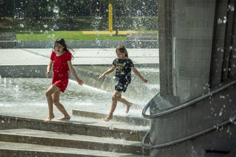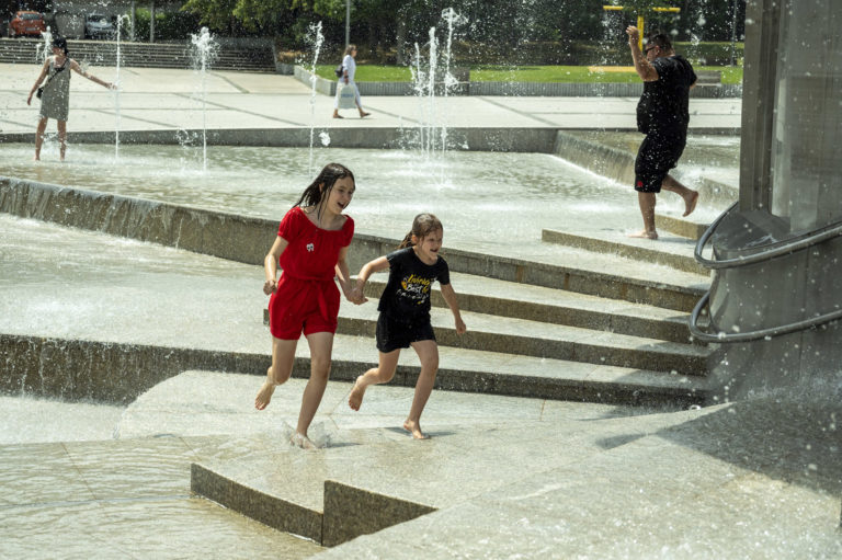 Ľudia osviežujúci sa vo fontáne Družba počas tropických teplôt v uliciach hlavného mesta Bratislava. Bratislava, 21. jún 2024. Foto: SITA/Milan Illík