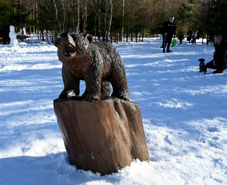 Vyrezávaný medveď z dreva v Príjemnej zóne na Dolnej lúke na Hrebienku. Vysoké Tatry, 18. január 2025. Foto: SITA/Viktor Zamborský