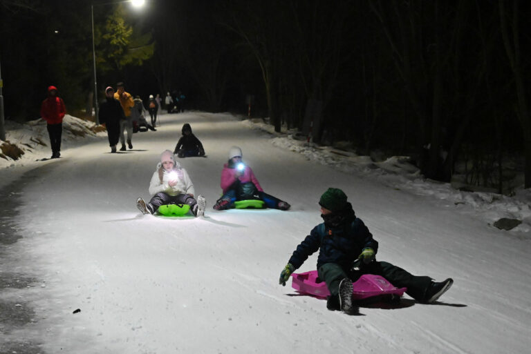 Turisti a deti počas sánkovania na osvetlenej ceste vedúcej na Hrebienok. Vysoké Tatry, 18. január 2025. Foto: SITA/Viktor Zamborský