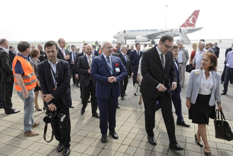 Účastníci slávnostného príletu prvého lietadla spoločnosti Turkish Airlines pri príležitosti oficiálneho otvorenia leteckej linky medzi Istanbulom a Košicami. Košice 16. jún 2016. Foto: SITA/Ivan Fleischer