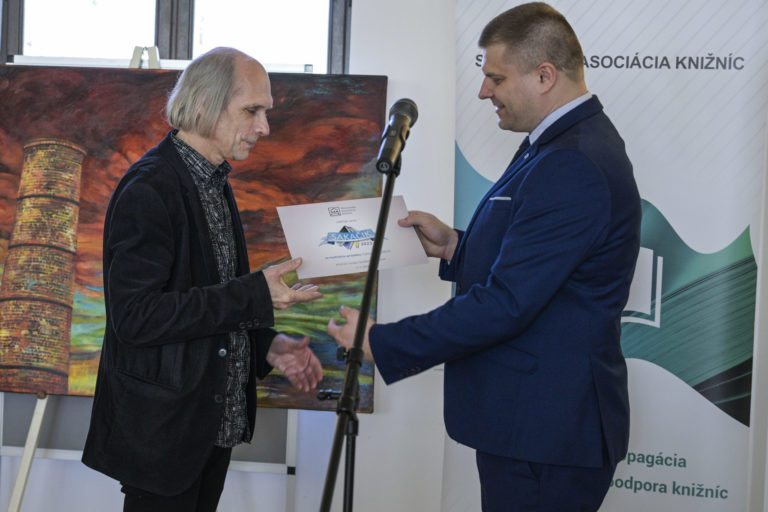 Zľava: Riaditeľ Krajskej knižnice Juraja Fándlyho v Trnave Pavol Tomašovič a predseda SAK Ondrej Látka počas preberania ceny v rámci súťaže Sakáčik za výnimočnú aktivitu členskej knižnice SAK v roku 2023 pri príležitosti otvorenia podujatia Týždeň slovenských knižníc 2024, organizovaného Slovenskou asociáciou knižníc (SAK) vo výstavných priestoroch Západnej terasy Bratislavského hradu. Bratislava, 4. marec 2024. Foto: SITA/Milan Illík.