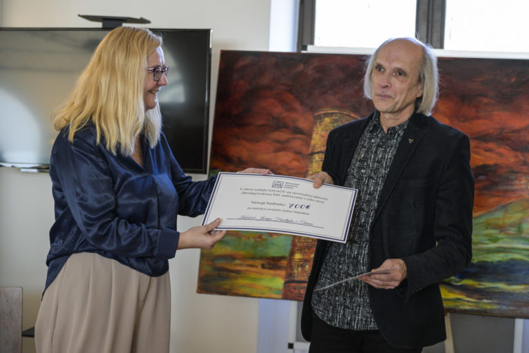 Zľava: Raditeľka Knižnice pre mládež mesta Košice Kamila Prextová a riaditeľ krajskej Knižnice Juraja Fándlyho v Trnave Pavol Tomašovič počas preberania ceny v rámci súťaže Sakáčik za výnimočnú aktivitu členskej knižnice Slovenskej asociácie knižníc (SAK), realizovaný v roku 2023 pri príležitosti otvorenia podujatia Týždeň slovenských knižníc 2024 vo výstavných priestoroch Západnej terasy Bratislavského hradu. Bratislava, 4. marec 2024. Foto: SITA/Milan Illík.