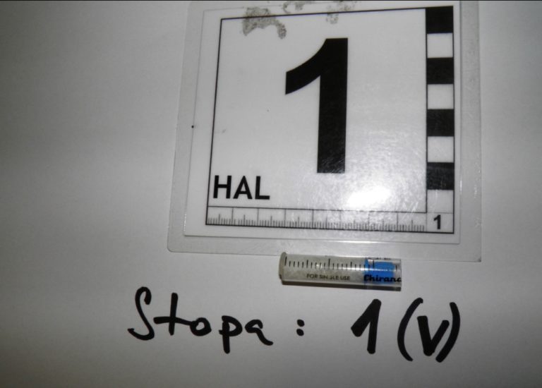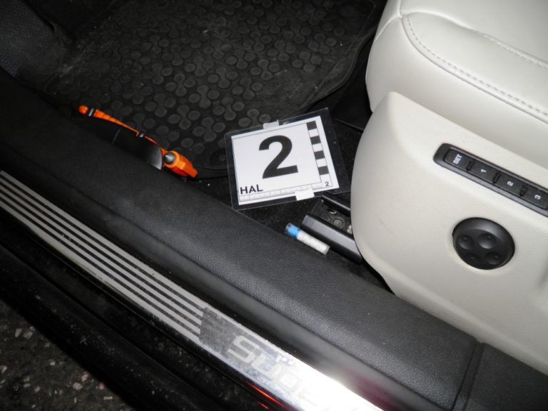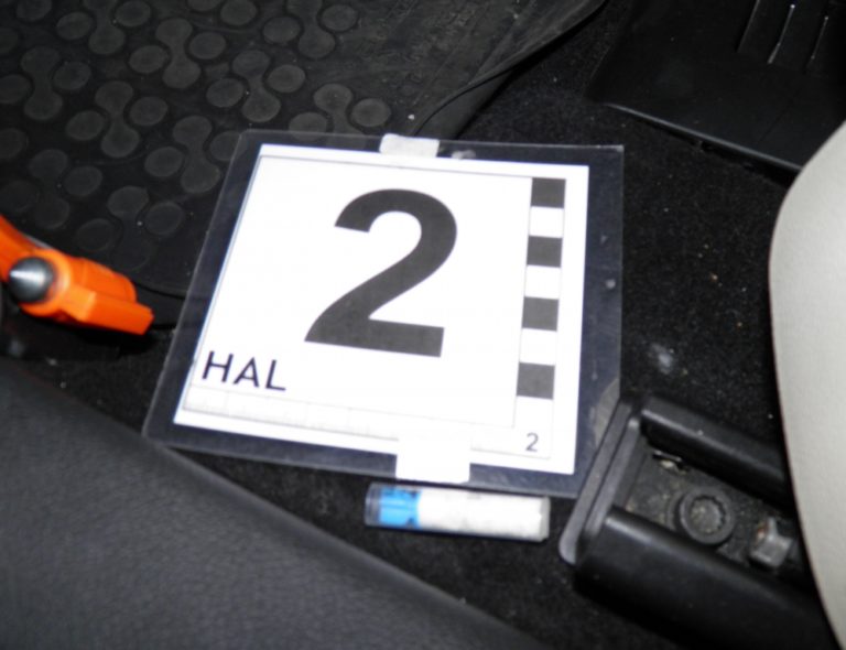 Viac ako sto dávok pervitínu našli policajti 33-ročnému Bratislavčanovi. Pri kontrole jeho auta na bratislavskom Námestí Franza Liszta zaistili zatavenú striekačku a kovovú fajku so sušenou rastlinou. Bratislava, 2. apríl 2014. Foto: SITA/KR PZ Bratislava