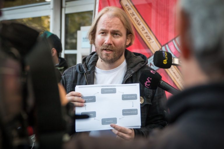 Viceprezident Slovenskej komory učiteľov (SKU) Vladimír Crmoman v rozhovore s novinármi počas bazálneho pochodu učiteľov, ktorý organizuje štrajkový výbor Iniciatívy slovenských učiteľov. Bratislava, 7. október 2016. Foto: SITA/Marek Mrviš