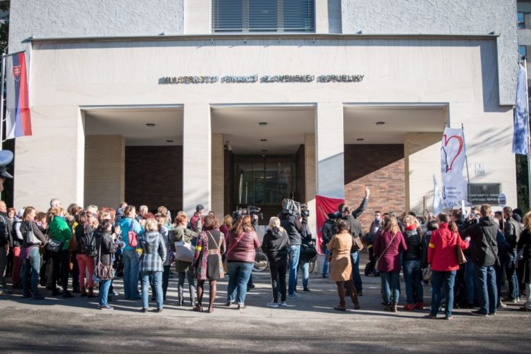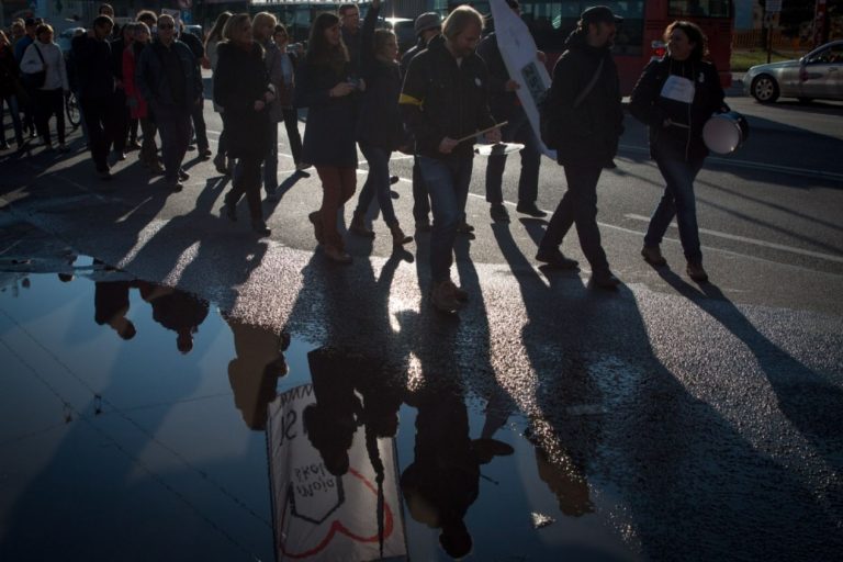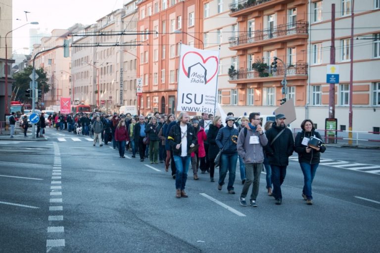 Účastníci počas bazálneho pochodu učiteľov, ktorý organizuje štrajkový výbor Iniciatívy slovenských učiteľov. Bratislava, 7. október 2016. Foto: SITA/Marek Mrviš