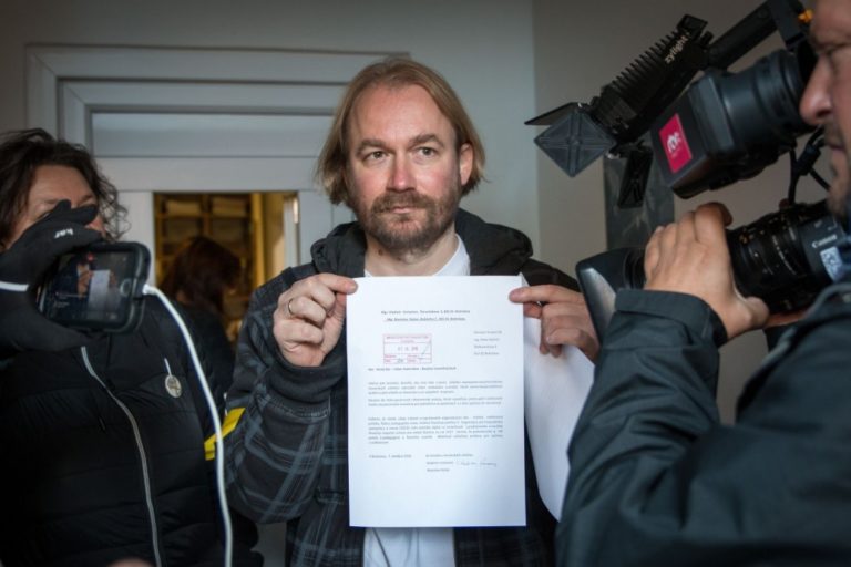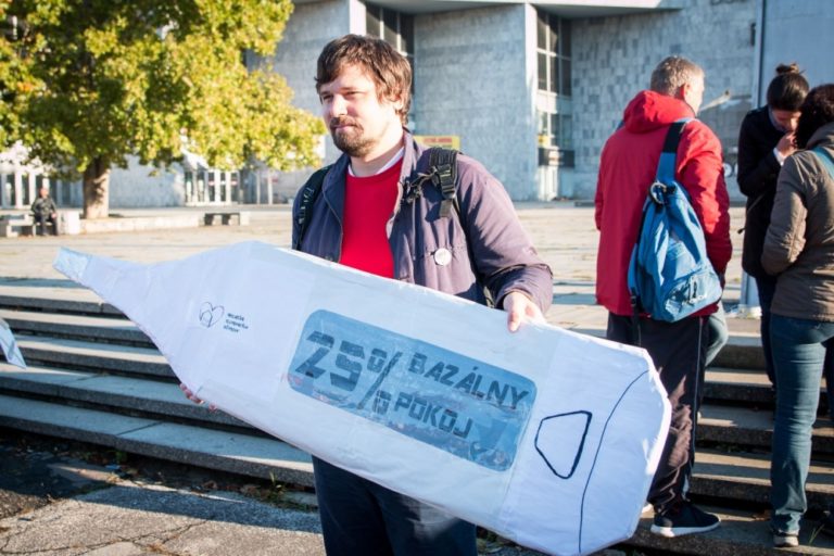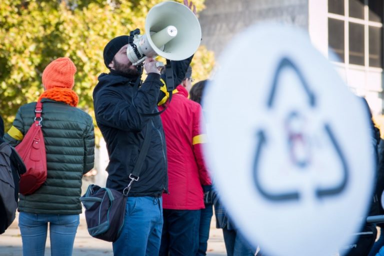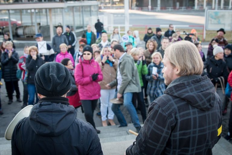 Viceprezident Slovenskej komory učiteľov (SKU) Vladimír Crmoman počas bazálneho pochodu učiteľov, ktorý organizuje štrajkový výbor Iniciatívy slovenských učiteľov. Bratislava, 7. október 2016. Foto: SITA/Marek Mrviš