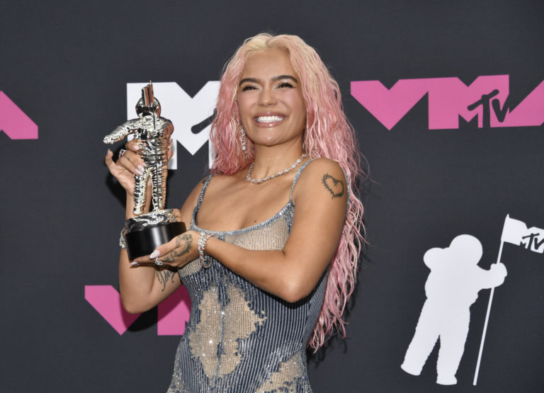 Karol G s cenou za najlepšiu spoluprácu za skladbu „TQG“ počas udeľovania cien MTV Video Music Awards. Foto: SITA/AP