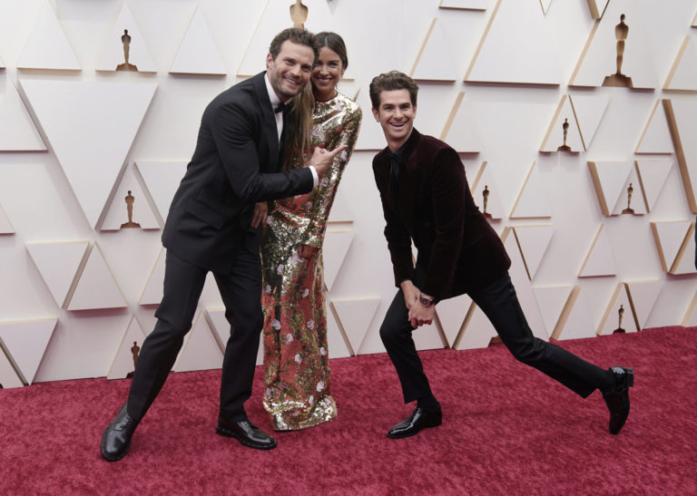 Jamie Dornan (vľavo), Amelia Warner a Andrew Garfield. Foto: SITA/AP