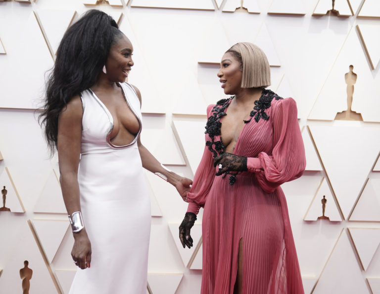 Tenistky Venus Williams (vľavo) a Serena Williams prichádzajú na udeľovanie cien Oscar 2022. Foto: SITA/AP