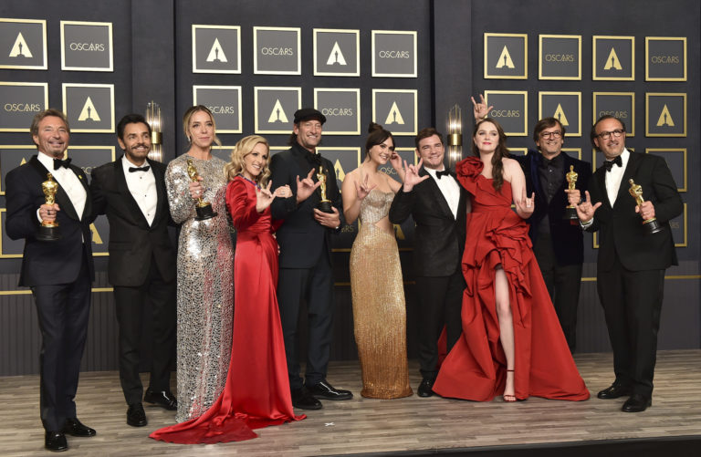 Herci a štáb filmu "CODA" si preberajú cenu za najlepší film. Foto: SITA/AP