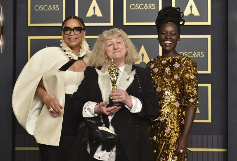 Jenny Beavan, víťazka ceny za najlepší kostýmový návrh pre „Cruella“ (v strede), Ruth E. Carter (vľavo) a Lupita Nyong'o pózujú v tlačovej miestnosti na odovzdávaní Oscarov. Foto: SITA/AP