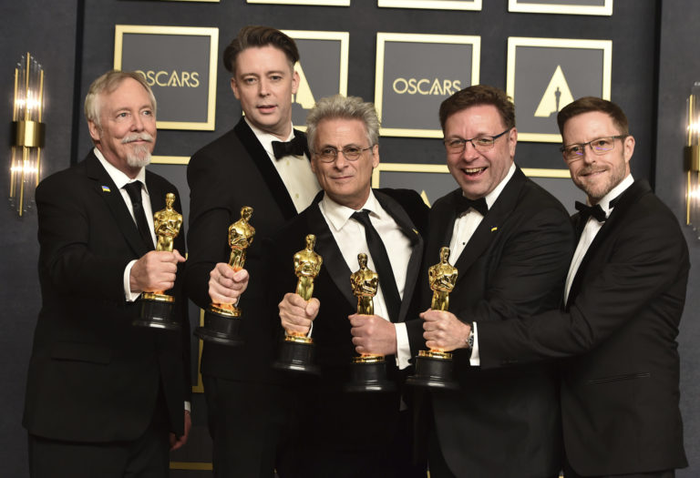Zľava: Doug Hemphill, Theo Green, Mark Mangini, Ron Bartlett, Mac Ruth, víťazi ceny za najlepší zvuk za skladbu „Duna“. Foto: SITA/AP