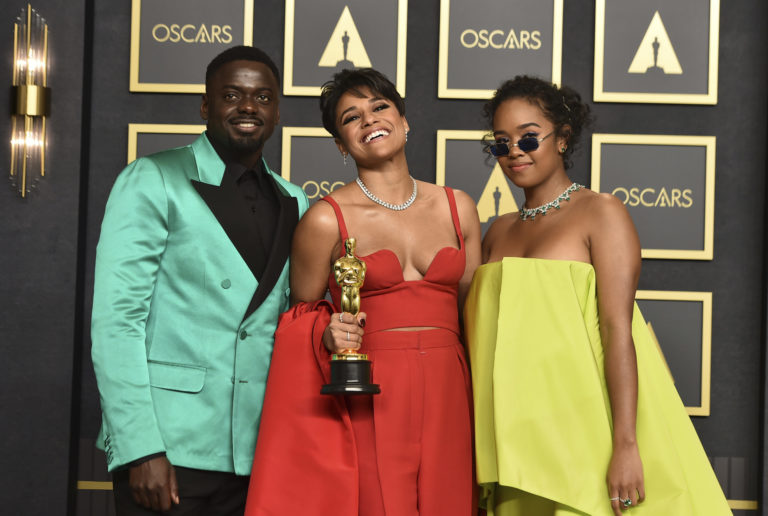 Ariana DeBose, víťazka ceny za najlepší výkon herečky vo vedľajšej úlohe vo filme „West Side Story“, v strede, pózuje v tlačovej miestnosti s Danielom Kaluuyom (vľavo) a H.E.R. na odovzdávaní Oscarov. Foto: SITA/AP