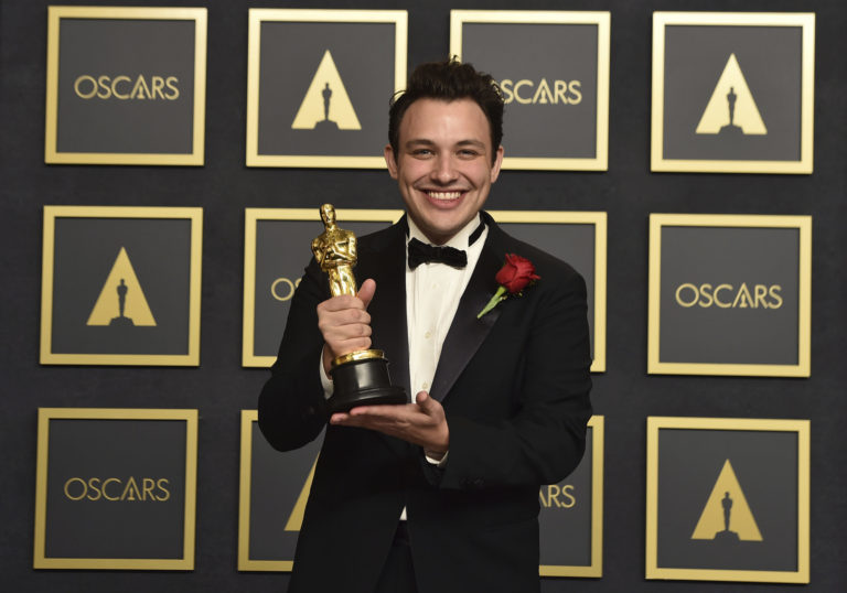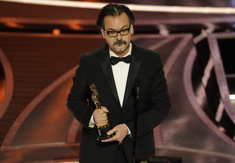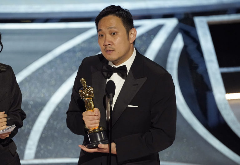 Ryusuke Hamaguchi preberá cenu za najlepší medzinárodný celovečerný film za film „Drive My Car“ z Japonska. Foto: SITA/AP