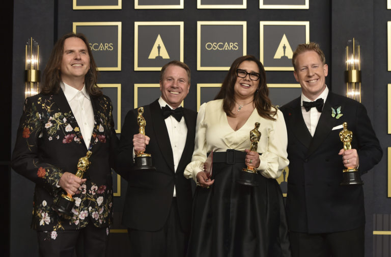 Zľava: Bryon Howard, Clark Spencer, Yvett Merino a Jared Bush, víťazi ceny za najlepší celovečerný animovaný film za "Encanto". Foto: SITA/AP