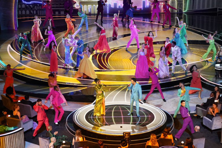 Becky G (v strede vľavo) a Luis Fonsi (vpravo) vystúpili v Dolby Theatre v Los Angeles s predstavením „We Don't Talk About Bruno“ z „Encanto“ na odovzdávaní Oscarov. Foto: SITA/AP