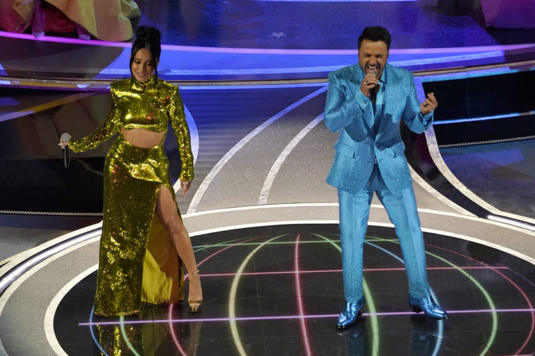 Becky G a Luis Fonsi spievajú pesničku z animovaného filmu Encanto. Foto: SITA/AP