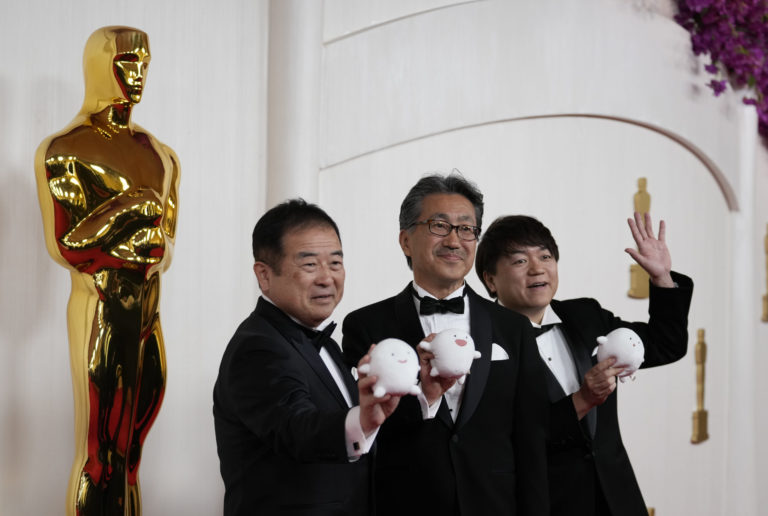 Zľava: Hiroyuki Fukuda, Kiyofumi Nakajima a Kenichi Yoda počas príchodu na 96. ročník udeľovania cien americkej Akadémie filmových umení a vied (Oscar 2024). Los Angeles (Dolby Theatre), 10. marec 2024. Foto: SITA/AP.