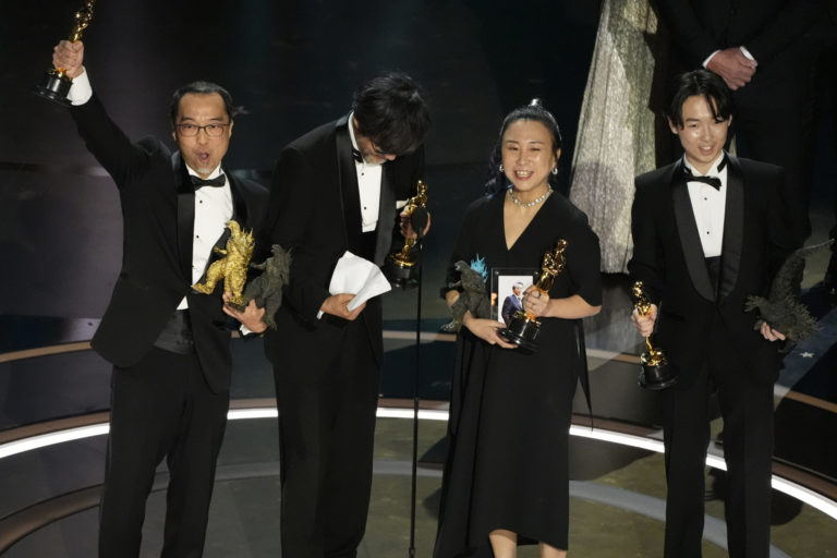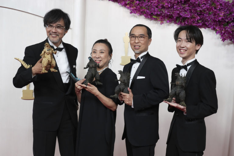 Zľava: Masaki Takahashi, Takashi Yamazaki, Kiyoko Shibuya a Tatsuji Nojima získali Oscara za najlepšie vizuálne efekty za film „Godzilla Minus One“ počas 96. ročníka udeľovania cien americkej Akadémie filmových umení a vied (Oscar 2024). Los Angeles (Dolby Theatre), 10. marec 2024. Foto: SITA/AP.