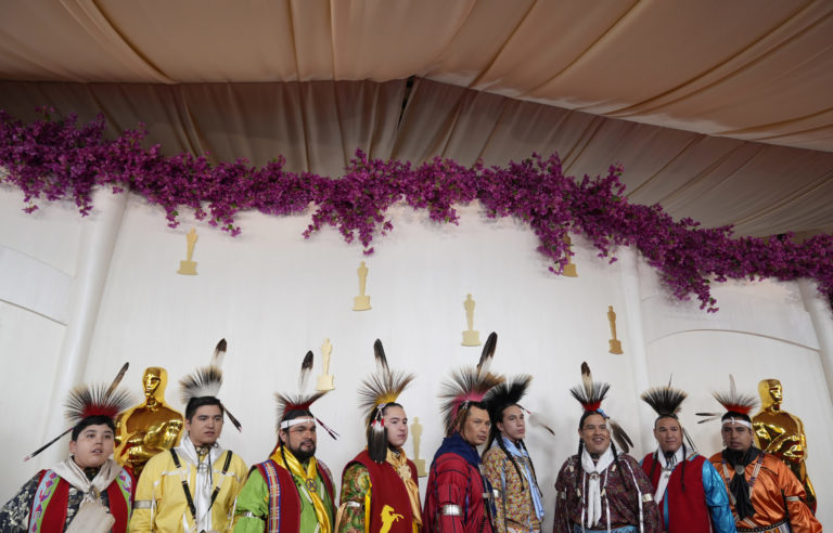 Speváci a tenečníci zoskupenia Osage singers počas príchodu na 96. ročník udeľovania cien americkej Akadémie filmových umení a vied (Oscar 2024). Los Angeles (Dolby Theatre), 10. marec 2024. Foto: SITA/AP.