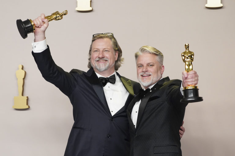 Zľava: Dave Mullins a Brad Booker pózujú s Oscarmi, ktorých získali za najlepší krátky animovaný film VOJNA SA SKONČILA! Inšpirované hudbou Johna a Yoko počas 96. ročníka udeľovania cien americkej Akadémie filmových umení a vied (Oscar 2024). Los Angeles (Dolby Theatre), 10. marec 2024. Foto: SITA/AP.