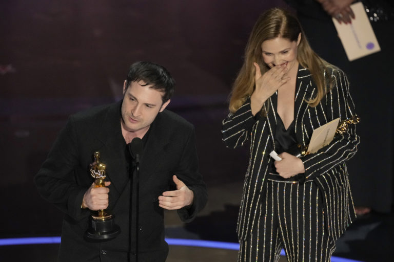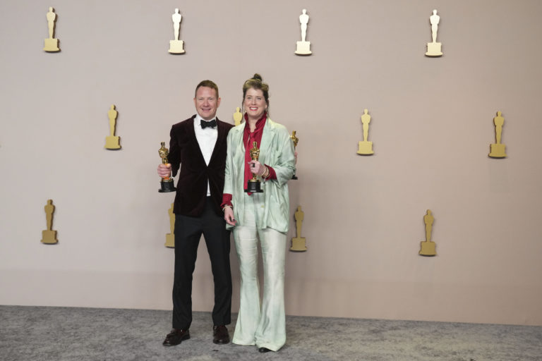 Zľava: Arthur Harari a Justine Triet získali Oscara za najlepší pôvodný scenár za film "Anatómia pádu" počas 96. ročníka udeľovania cien americkej Akadémie filmových umení a vied (Oscar 2024). Los Angeles (Dolby Theatre), 10. marec 2024. Foto: SITA/AP.