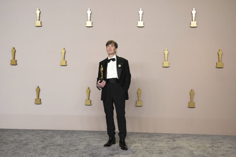 Cillian Murphy pózuje so soškou Oscara, ktorú získal za najlepší mužský herecký výkon v hlavnej úlohe za film "Oppenheimer" počas 96. ročníka udeľovania cien americkej Akadémie filmových umení a vied (Oscar 2024). Los Angeles (Dolby Theatre), 10. marec 2024. Foto: SITA/AP.