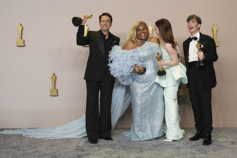 Zľava: Herec Robert Downey Jr., víťaz ceny najlepší herec za vedľajšiu úlohu vo filme "Oppenheimer," Da'Vine Joy Randolph, víťazka ceny najlepšia herečka za vedľajšiu úlohu vo filme "Zimné prázdniny", Emma Stone, víťazka ceny za najlepší výkon herečky v hlavnej úlohe za film "Chudiatko" a Cillian Murphy, víťaz ceny za najlepší výkon herca v hlavnej úlohe vo filme "Oppenheimer" počas 96. ročníka udeľovania cien americkej Akadémie filmových umení a vied (Oscar 2024). Los Angeles (Dolby Theatre), 10. marec 2024. Foto: Photo by Jordan Strauss/Invision/AP.