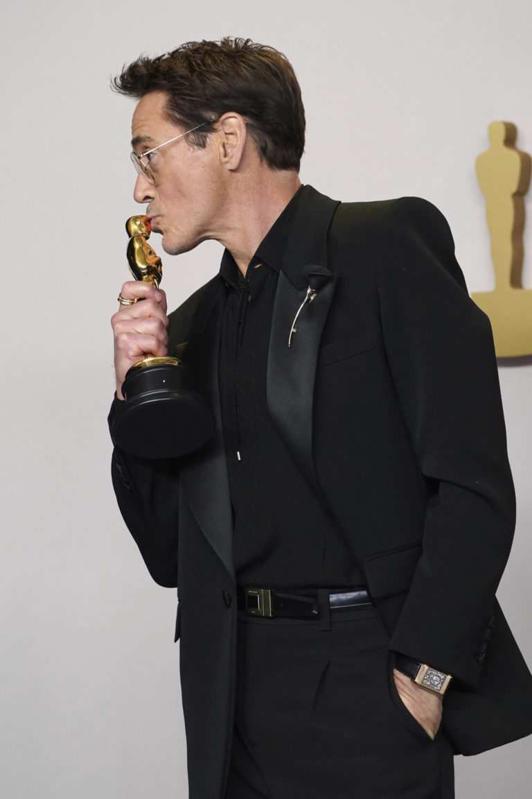 Robert Downey Jr. bozkáva sošku Oscara, ktorú získal za najlepší mužský herecký výkon za vedľajšiu úlohu vo filme "Oppenheimer" počas 96. ročníka udeľovania cien americkej Akadémie filmových umení a vied (Oscar 2024). Los Angeles (Dolby Theatre), 10. marec 2024. Foto: SITA/AP.
