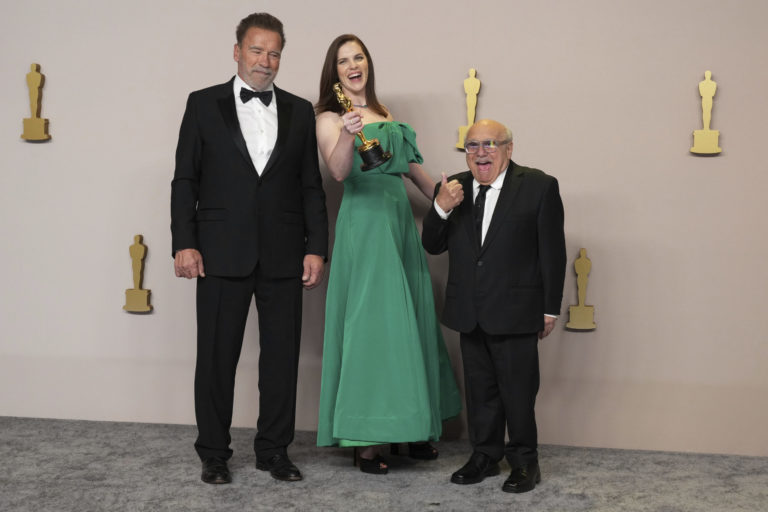 Jennifer Lame (uprostred) získala Oscara za najlepší strih vo filme "Oppenheimer" počas 96. ročníka udeľovania cien americkej Akadémie filmových umení a vied (Oscar 2024), kde spolu s ňou pózujú Arnold Schwarzenegger a Danny DeVito. Los Angeles (Dolby Theatre), 10. marec 2024. Foto: SITA/AP.