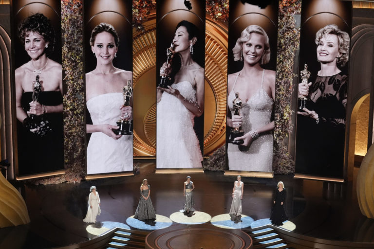 Zľava: Sally Field, Jennifer Lawrence, Michelle Yeoh, Charlize Theron and Jessica Lange počas 96. ročníka udeľovania cien americkej Akadémie filmových umení a vied (Oscar 2024). Los Angeles (Dolby Theatre), 10. marec 2024. Foto: SITA/AP.