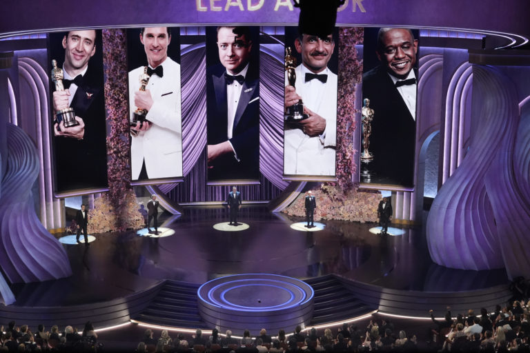 Zľava: Nicolas Cage, Matthew McConaughey, Brendan Fraser, Ben Kingsley a Forest Whitaker pošas za najlepšiu pôvodnú filmovú pieseň "What Was I Made For? " z filmu Barbie počas 96. ročníka udeľovania cien americkej Akadémie filmových umení a vied (Oscar 2024). Los Angeles (Dolby Theatre), 10. marec 2024. Foto: SITA/AP.
