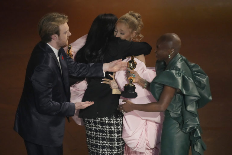 Zľava: Finneas O'Connell a Billie Eilish získali Oscarov za najlepšiu pôvodnú filmovú pieseň "What Was I Made For? " z filmu Barbie počas 96. ročníka udeľovania cien americkej Akadémie filmových umení a vied (Oscar 2024). Los Angeles (Dolby Theatre), 10. marec 2024. Foto: SITA/AP.