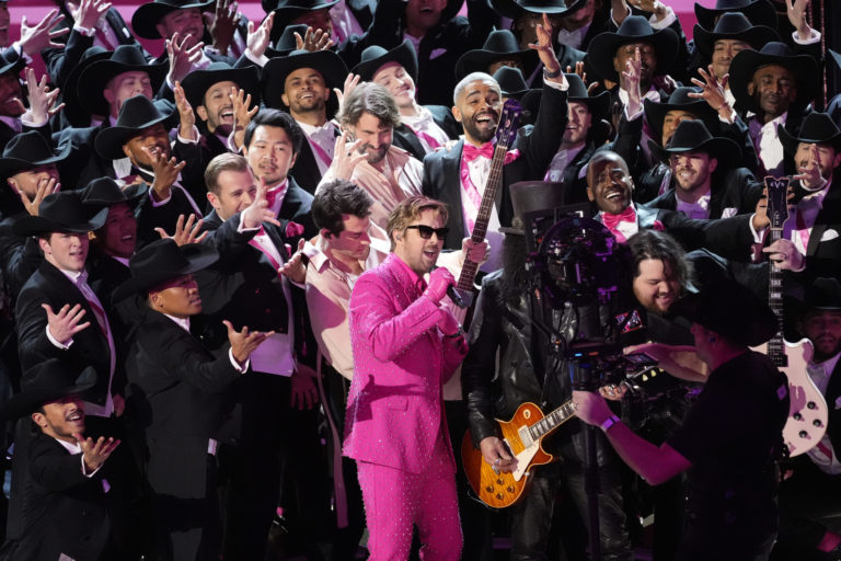 Ryan Gosling počas spievania "I'm Just Ken" z filmu"Barbie" počas 96. ročníka udeľovania cien americkej Akadémie filmových umení a vied (Oscar 2024). Los Angeles (Dolby Theatre), 10. marec 2024. Foto: SITA/AP.