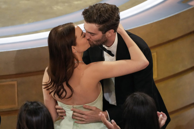 Emma Stone a Dave McCary sa bozkávajú po tom, čo Emma Stone získala Oscara za najlepší ženský herecký výkon v hlavnej úlohe vo filme "Chudiatko" počas 96. ročníka udeľovania cien americkej Akadémie filmových umení a vied (Oscar 2024). Los Angeles (Dolby Theatre), 10. marec 2024. Foto: SITA/AP.