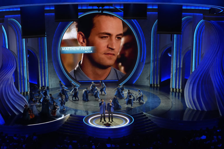 Zľava: Matteo Bocelli, a Andrea Bocelli vystúpili s piesňou "Time to say Goodbye" počas in memoriam časti na 96. ročníku udeľovania cien americkej Akadémie filmových umení a vied (Oscar 2024). Los Angeles (Dolby Theatre), 10. marec 2024. Foto: SITA/AP.